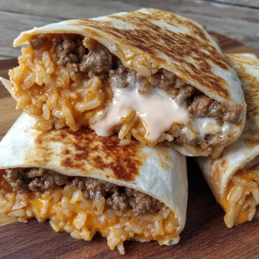 This dish brings together savory ground beef, aromatic onions, and a blend of Tex-Mex spices simmered in a rich tomato sauce. The filling is nestled into warm flour tortillas, layered with spicy mayo, creamy nacho cheese, and fluffy fried rice. Each burrito is then griddled until the exterior achieves a golden, crispy cheese crust, locking in every delicious bite. Fresh sour cream and crunchy tortilla chips add contrast and texture. Serve hot, and enjoy the harmony of zesty flavors and melty cheese that make this meal a true comfort food favorite.