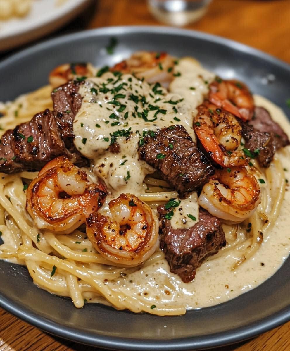 Cajun Shrimp and Steak Alfredo Pasta Introduction If you love bold flavors and creamy pasta, Cajun shrimp and steak Alfredo