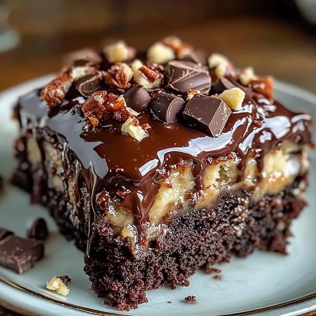 The German Chocolate Poke Cake follows this technique by combining the flavors of chocolate, coconut, and pecans with the gooeyness of a poke cake. The contrast between the cake’s soft crumb and the nutty, textured toppings creates a dessert that is not only delicious but also visually appealing and satisfying.
