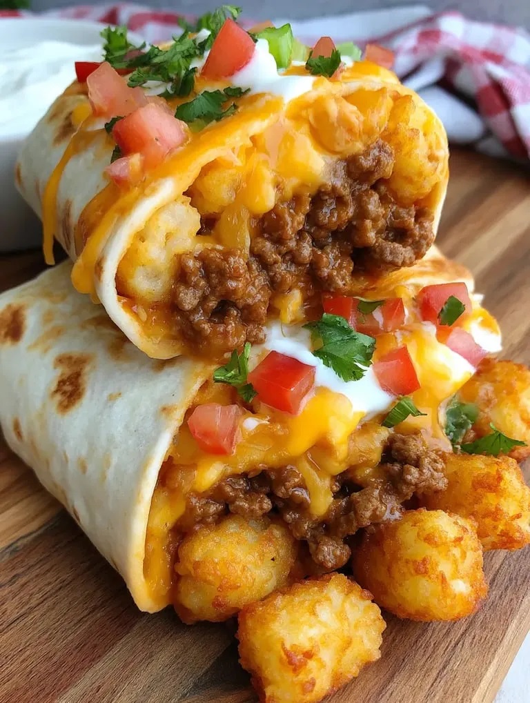 Cheesy Potato Burritos with Beef Introduction Crispy tater tots, savory ground beef, and melty cheese all wrapped in soft, warm