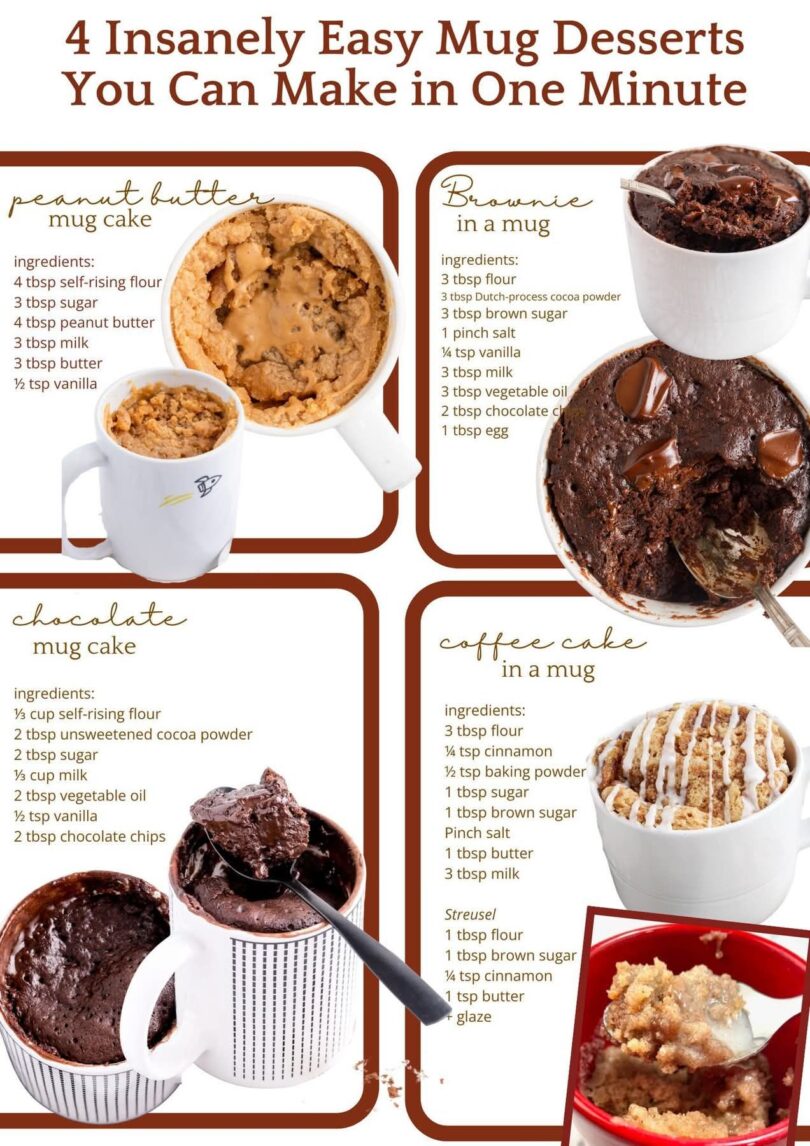 4 One-Minute Mug Cakes Who says you need a full oven to enjoy cake? These quick, single-serving mug cakes are