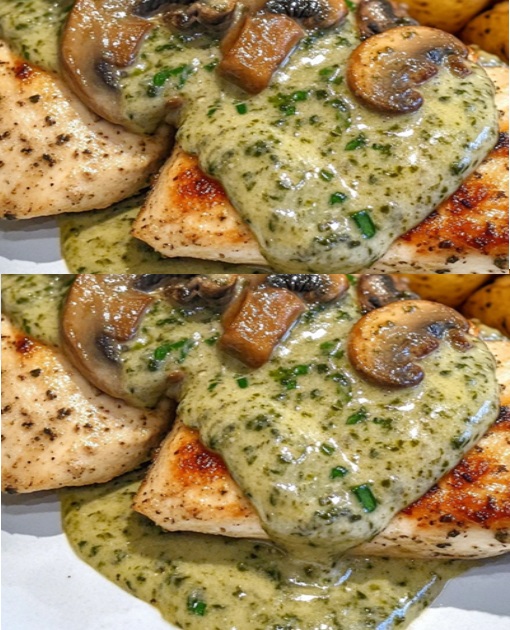 Creamy Garlic Mushroom Chicken with Herb-Roasted Potatoes & Basil Pesto Drizzle This Creamy Garlic Mushroom Chicken is the ultimate comfort