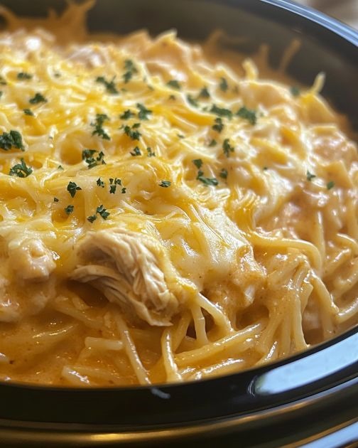 Slow Cooker Amish Cheesy Chicken Spaghetti