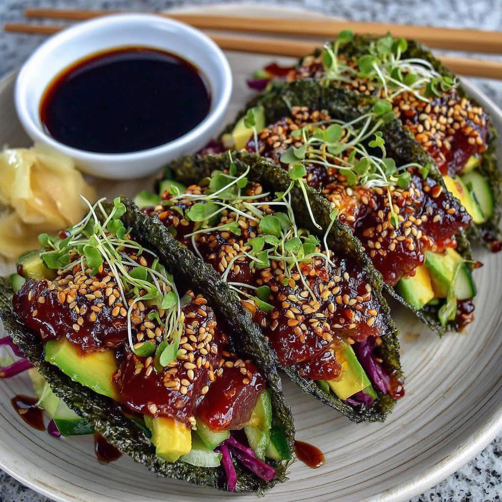 Where Japan meets Mexico in one unforgettable bite. These Sushi Tacos with Spicy Tuna & Avocado combine crispy nori-rice shells with creamy, spicy tuna and fresh toppings for the ultimate fusion experience. Crunchy, creamy, spicy, and refreshing all at once, they’re perfect for dinner parties, appetizers, or an elevated taco night. Elegant yet playful, these sushi tacos deliver bold flavor and stunning presentation in just 35 minutes.